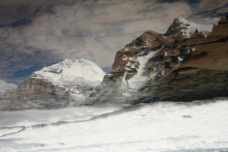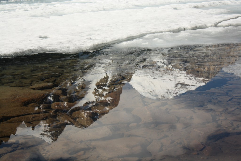 So, what did you see in the photo above? You probably saw snow, mountains and clouds. But did you get the sense something about it was “off”? If so, you were right – the image was inverted. Below is the original photo of a mountain range reflected in a rock-bottomed lake just as the winter ice is beginning to recede.